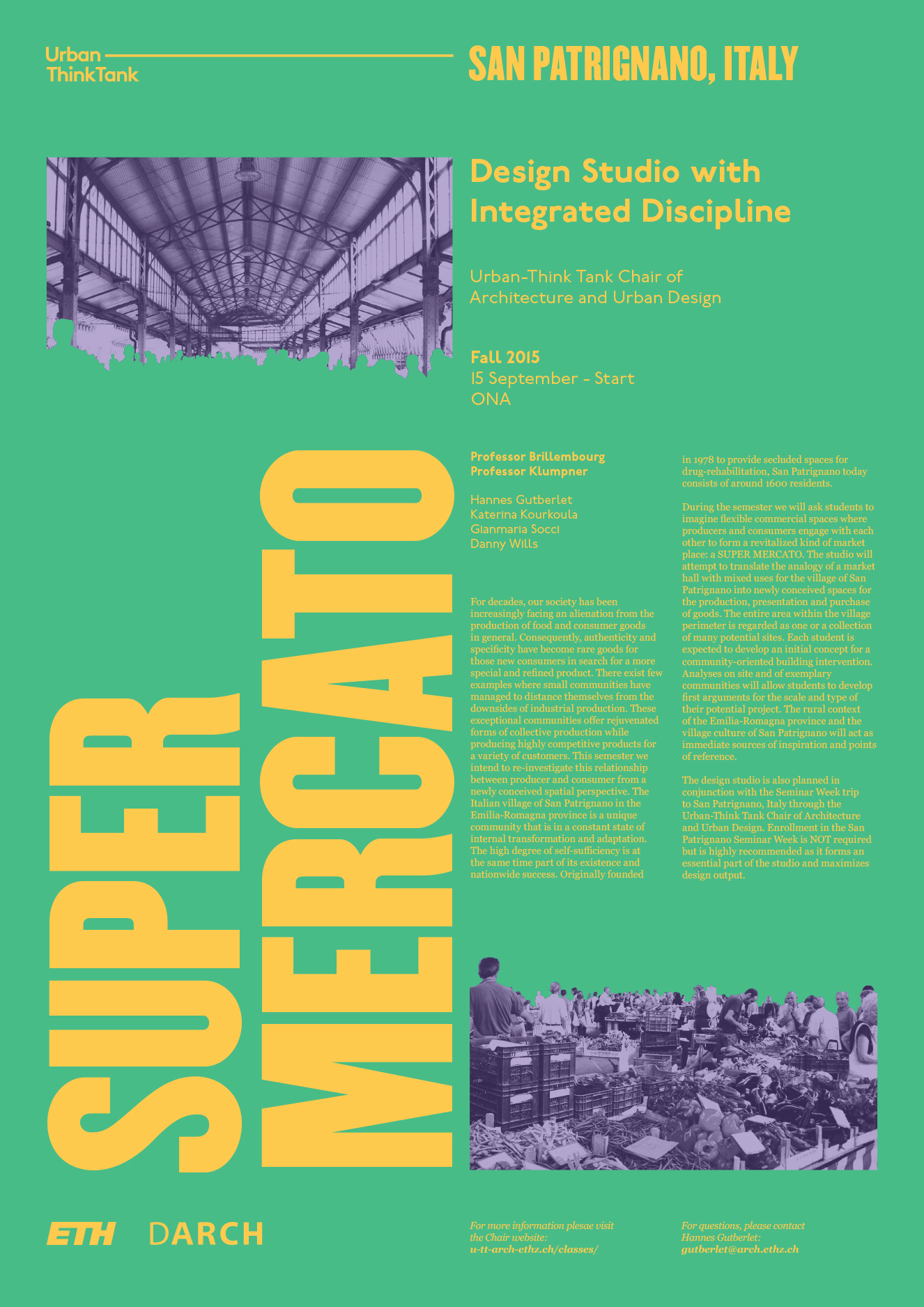 Founded in 1978 as a secluded site for drug rehabilitation, the Italian village of San Patrignano today consists of 1,600 residents whose therapy includes learning to produce food, furniture, and other goods. After visiting the community and markets in Emilia-Romagna, Urban-Think Tank’s design studio has been developing flexible market spaces for different sites in Bologna. The proposals are conceived as newly imagined spatial relationships between the production, presentation, and purchase of goods. On a social level, the sites will function as spatial activators where producers and consumers engage to form a revitalized kind of marketplace: a SUPER MERCATO. Hannes Gutberlet, Katerina Kourkoula and Gianmaria Socci.