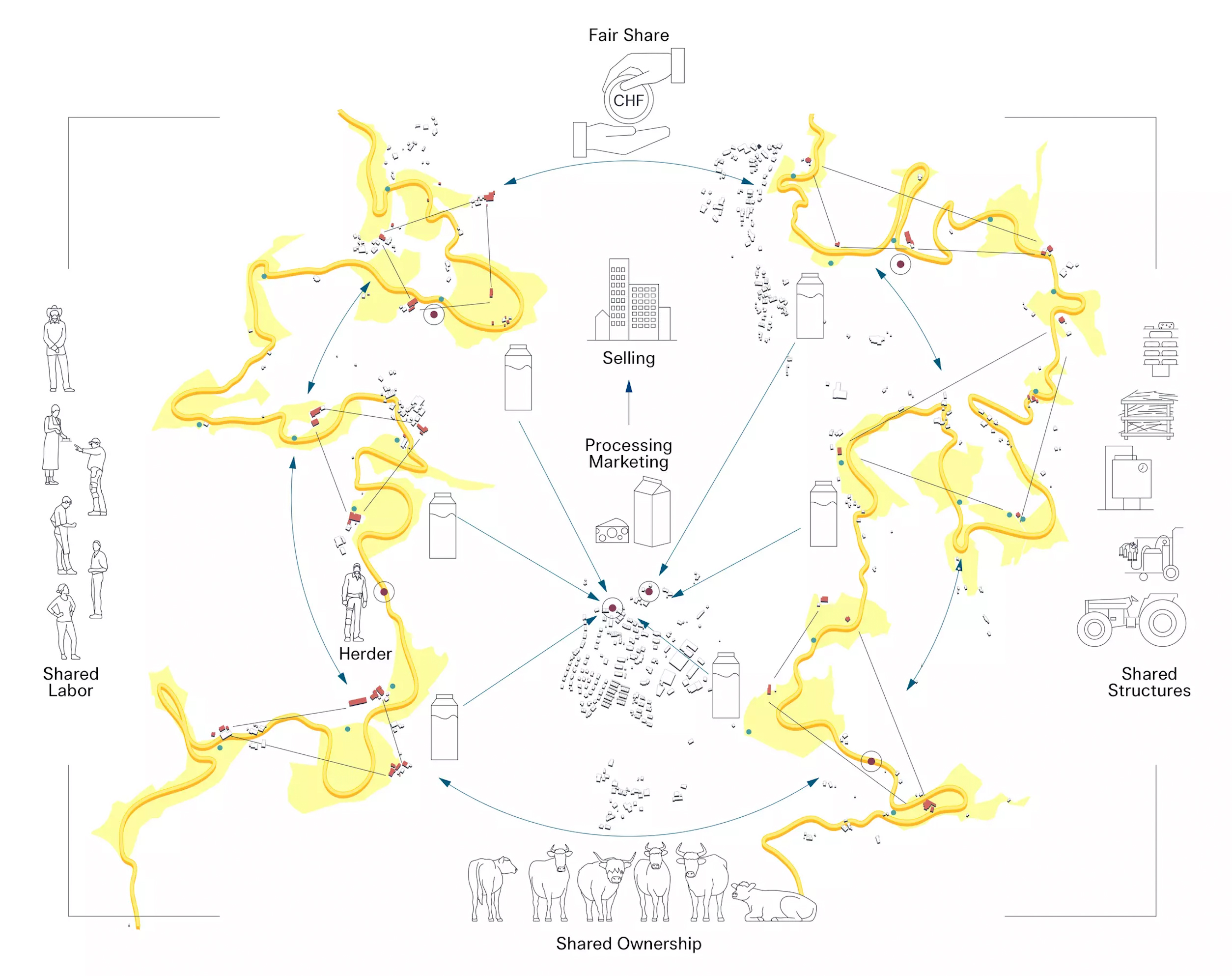 Neo-transhumance shapes the future imaginary for the Zurcher Oberland. «The Milky Way» breaks the picturesque image of the Swiss Alpine cows by uncovering the dairy industry’s intensive production in the lowlands of the Swiss plateau. The project proposes to reduce the herd size while facilitating the regenerative practice of rotational grazing, supported by a new ownership of cooperative use tied to the seasons of the dairy industry. The movement of the collective herd is flexible, responding to soil, microclimates, and weather conditions. Both new roles for part-time farmers, and the traditional roles of the herder emerge. The project demonstrates the potential for ecological coexistence between all forms of life and land.