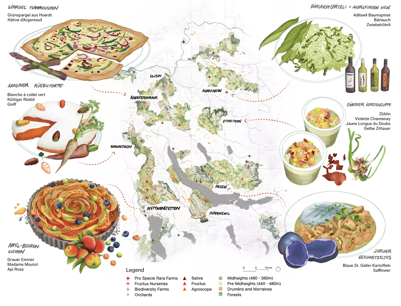 What does the future plate of food look like if species diversity is forefronted? Landscape patterns and species diversity form the base from which «Tasting grounds» have tested the potentials of a living seed bank in Mettmenstetten commune and the Canton of Zurich. Identifying the self-defined mosaic midheights, an «Agriterritory» of the canton, the group proposed an interruption to the global supply chain through a local system aimed at creating socio-cultural networks incorporating species diversity protected by its unique landscape of drumlin formations.