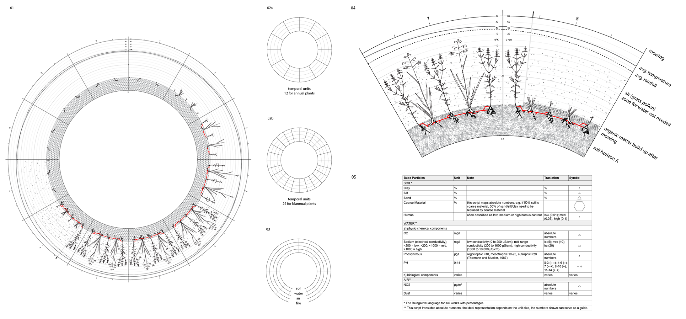 Integrated into the widely-used Rhino/Grasshopper platform, the BeingAliveLanguage enables professionals across various disciplines to generate easily understandable soil-centered diagrams automatically. The extensible system employs a node-based programming language, allowing users to create visually compelling and informative illustrations with ease, saving time and effort while enhancing the clarity and impact of the resulting visualizations.