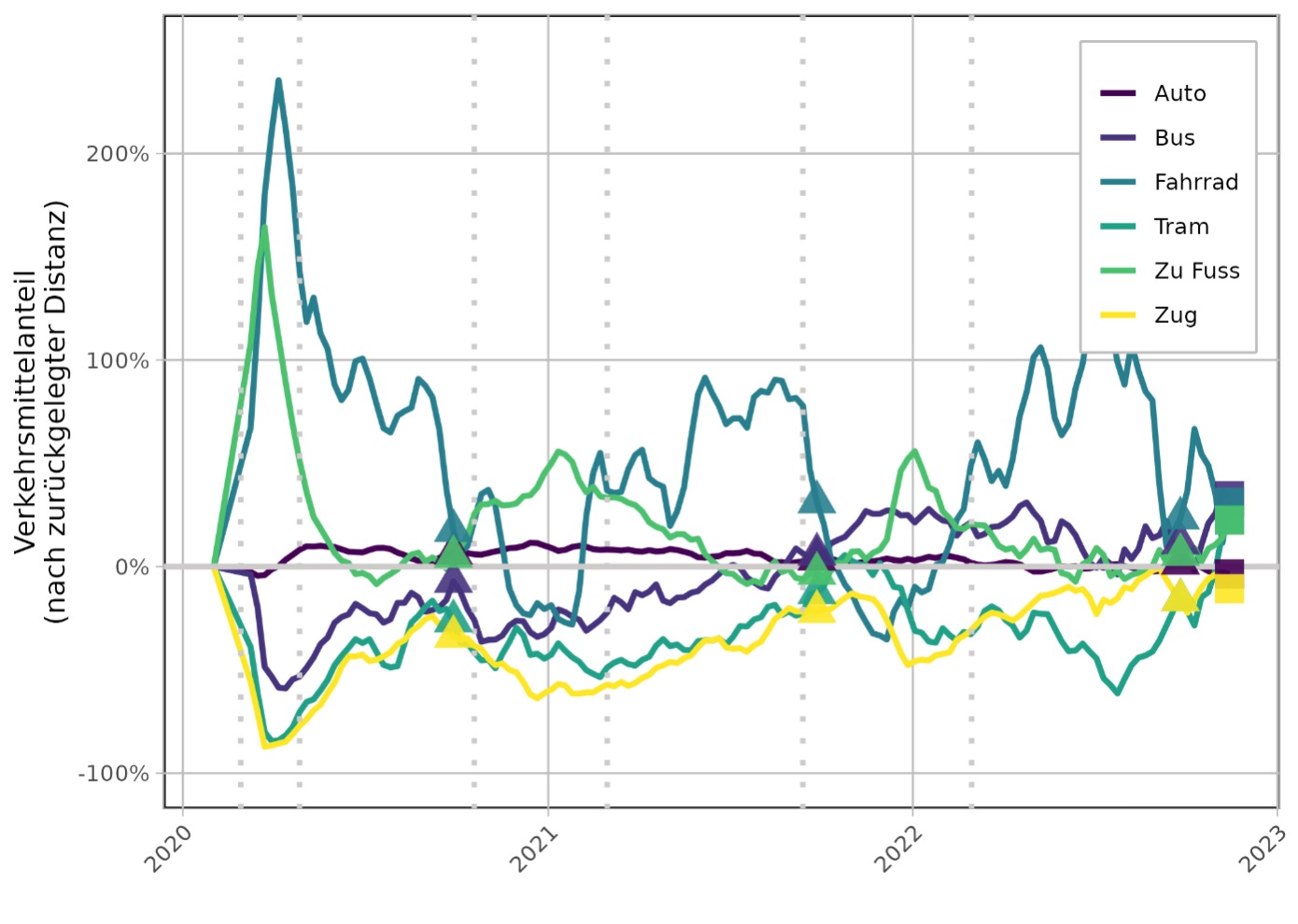 Die Präferenzen bezüglich Mobilitätsmittelwahl und daraus resultierende Verkehrsanteile haben sich im Zuge der Pandemie nicht nachhaltig verändert (Heimgartner & Axhausen, 2023). Menschen reagierten vielmehr auf die veränderten Umweltfaktoren (wie z.B. die Home office Pflicht und somit weniger Autoverkehr, was das Fahrradfahren zusätzlich attraktiv macht, oder eine wahrgenommen erhöhte Ansteckungsgefahr in den Zügen), die sich seither wieder normalisiert haben.