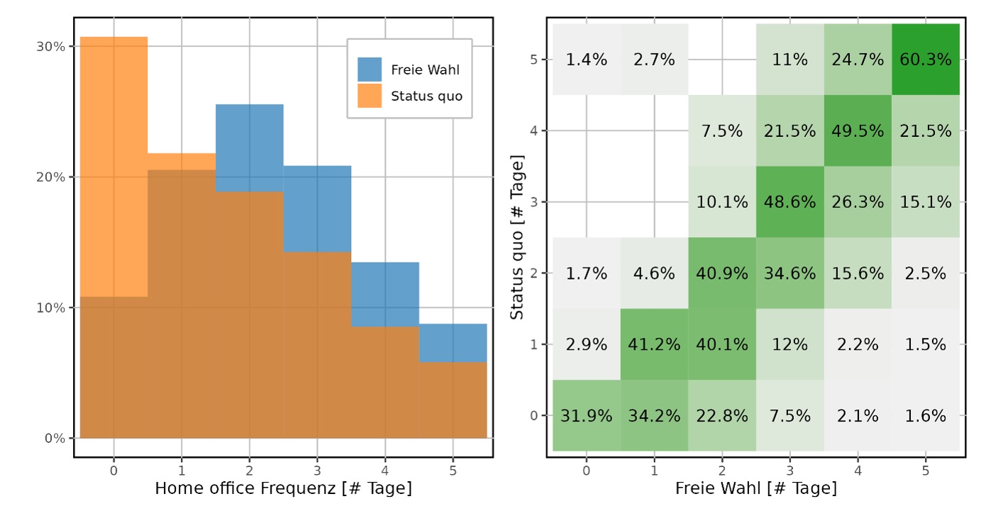 Unsere diskreten Wahlmodelle legen nahe, dass die Gestaltung der Arbeitsverträge (z.B. Lohnanpassungen) nur bedingt die aggregierte Nachfrage nach Home office beeinflussen können. Inwiefern sich der Status quo also noch verschiebt, wird primär durch den langfristigen Strukturwandel der weiteren Digitalisierung, den individuellen Präferenzen und der Verhandlungsmacht auf dem Arbeitsmarkt bestimmt. Ein wesentlicher Rückgang ist jedoch nicht zu erwarten.